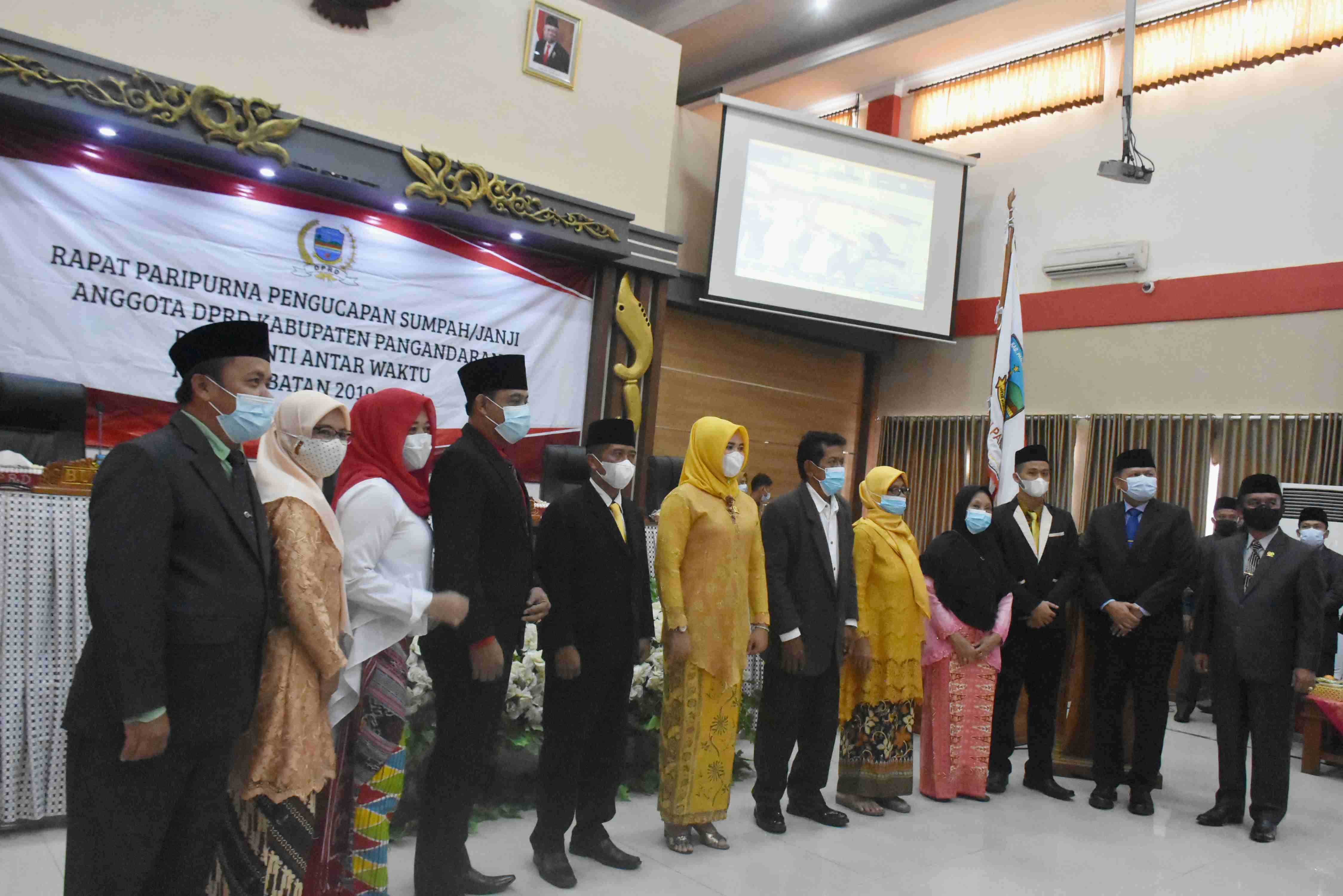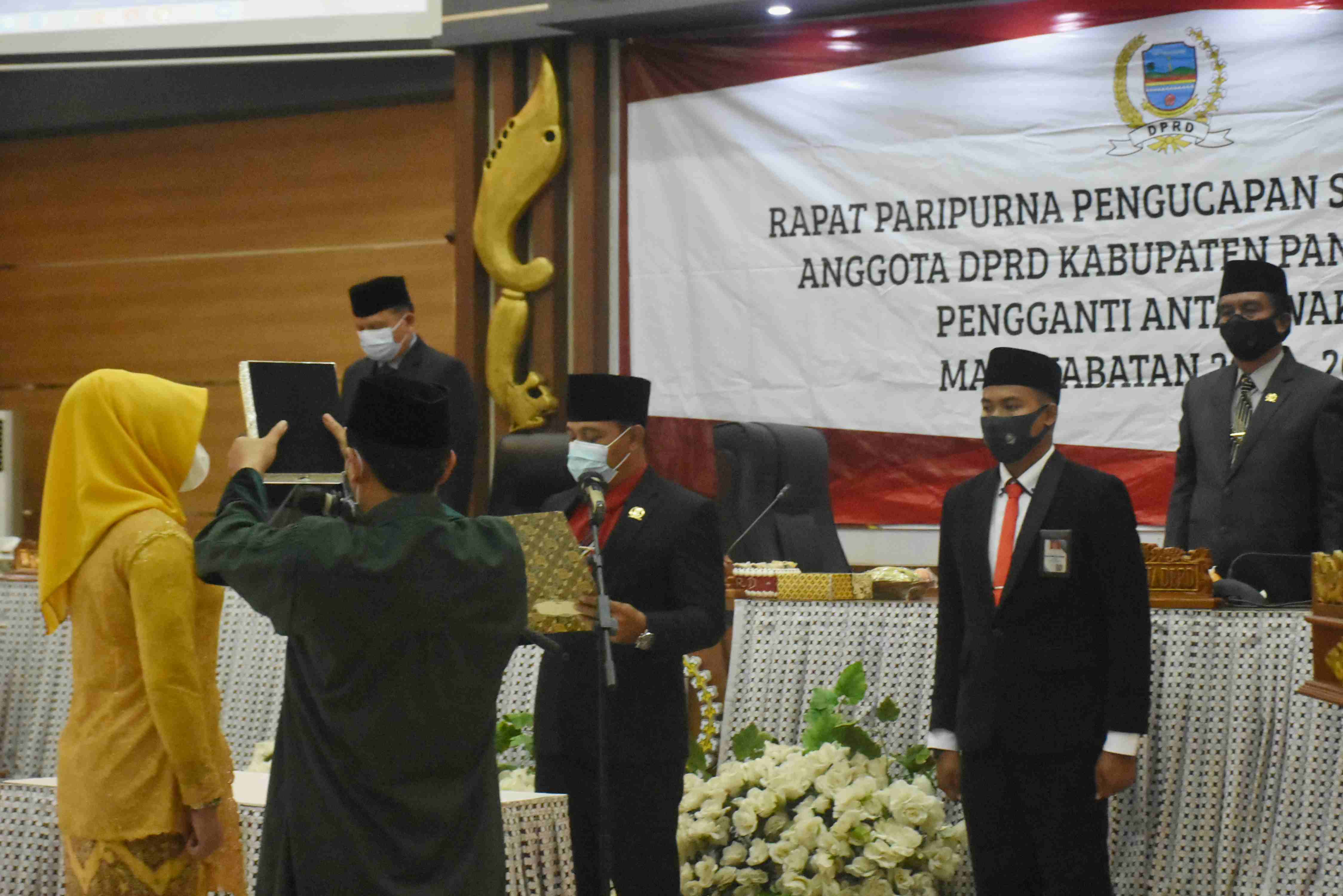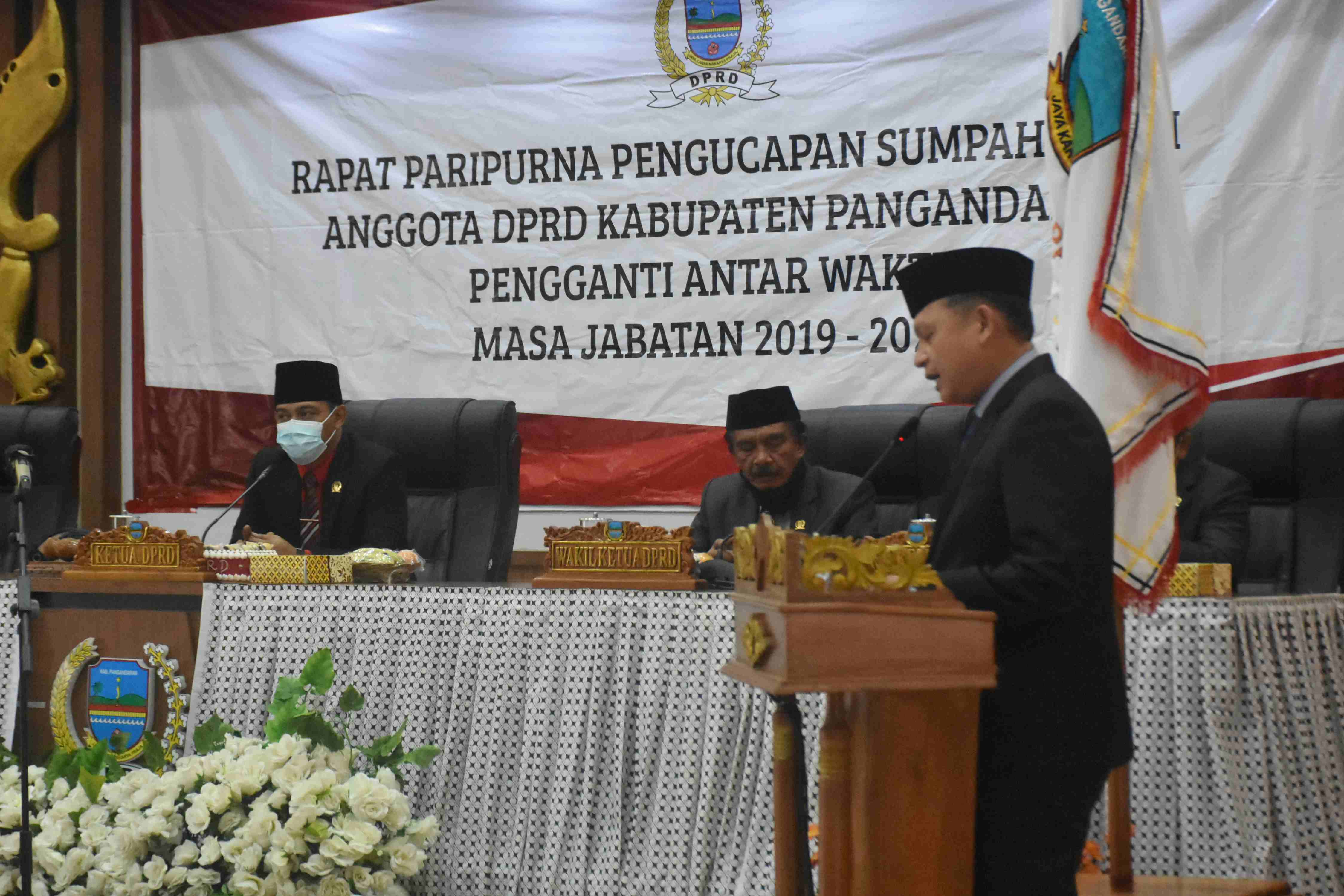 Plh Bupati Pangandaran H. Kusdiana hadiri Rapat Paripurna DPRD Kab. Pangandaran dalam rangka Pengucapan Sumpah dan Janji Anggota DPRD Kab. Pangandaran Pengganti Antar Waktu Periode 2019 - 2024 (Alm Drs. H. Jajang Mustofa digantikan oleh Wiwi Widaningsih dari Partai Golongan Karya), bertempat di Gd. Rapat Paripurna DPRD Kab. Pangandaran. Senin, 1 Februari 2021.
