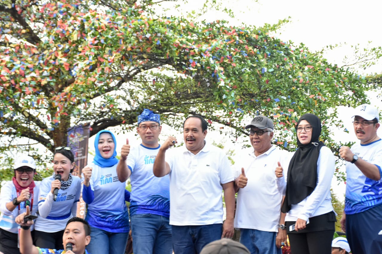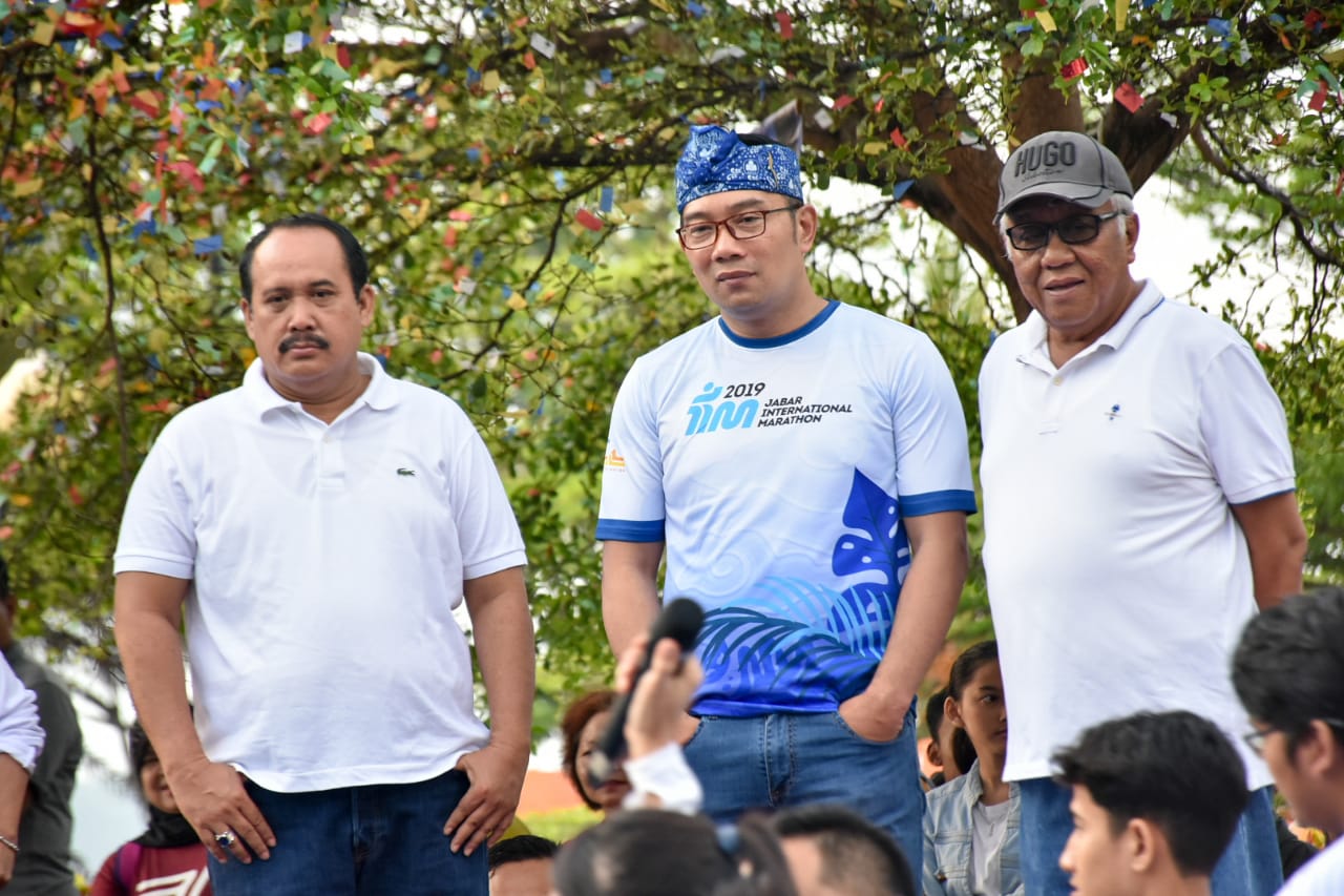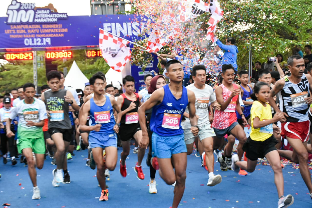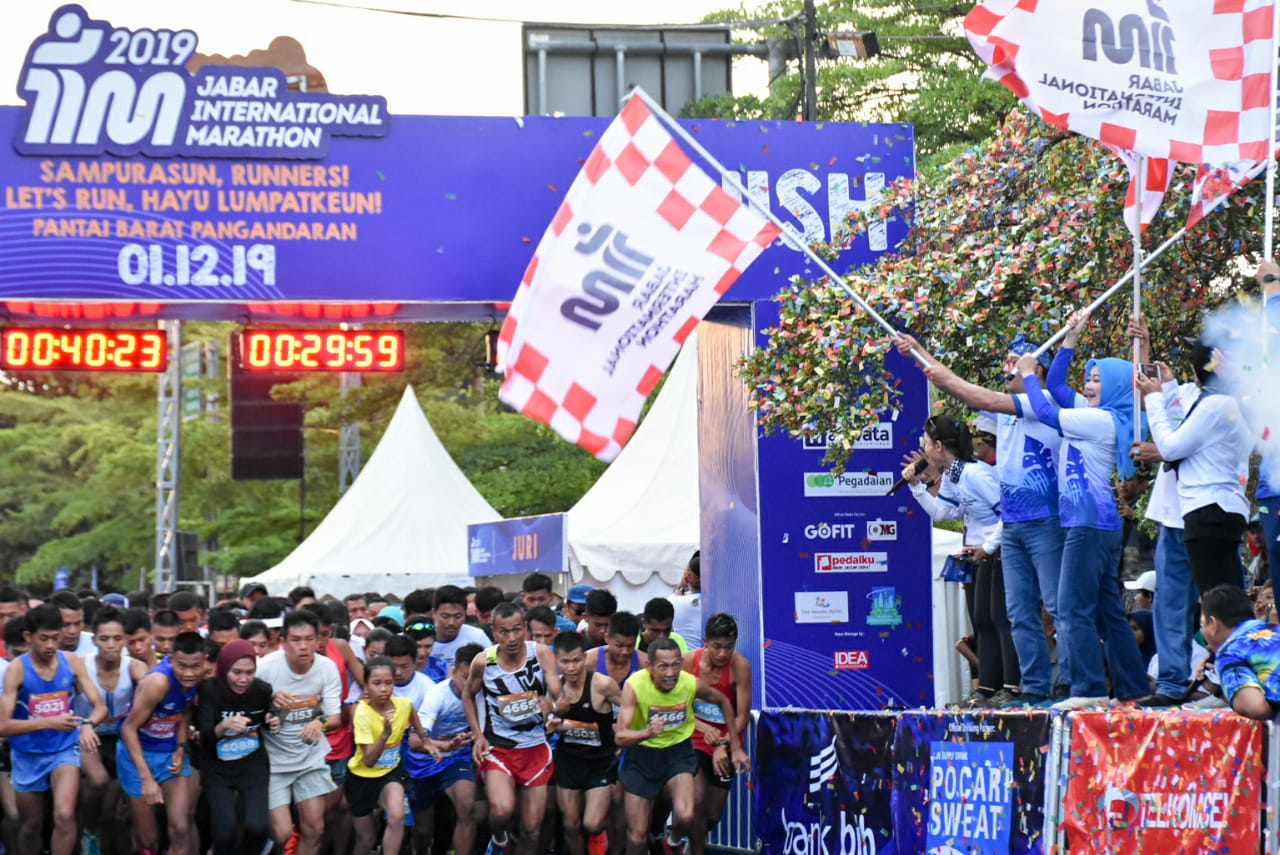 Bupati Pangandaran H. Jeje Wiradinata dan Wakil Bupati Pangandaran H. Adang Hadari mendampingi Gubernur Jawa Barat H. M. Ridwan Kamil, melepas peserta lari Jabar International Marathon 2019, di Pantai Barat Pangandaran. Minggu, 1 Desember 2019.