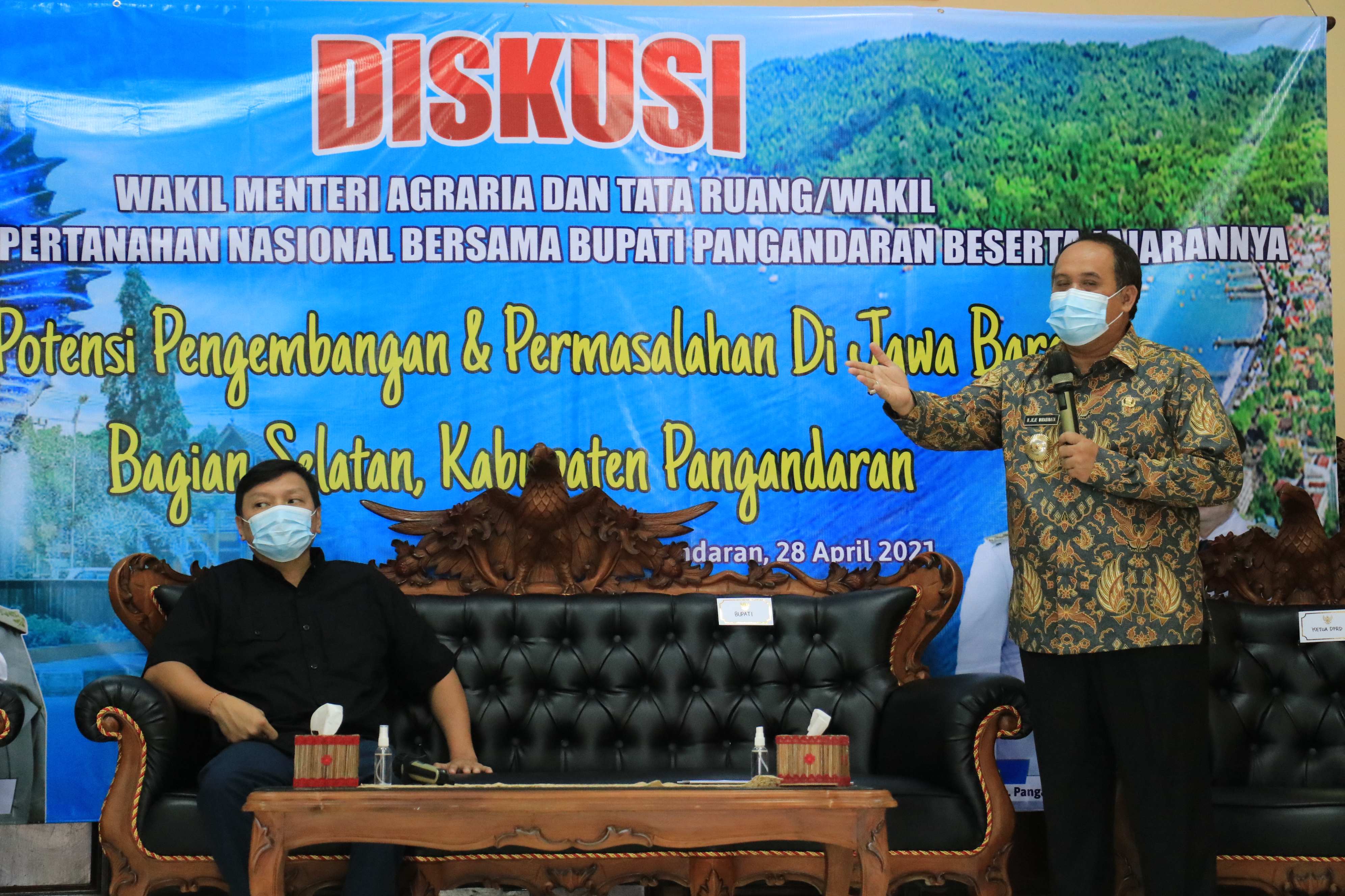 Bupati Pangandaran H. Jeje Wiradinata menerima kunjungan kerja Wakil Menteri Agraria dan Tata Ruang Dr. Surya Tjandra, S.H., LL.M pada acara Diskusi dengan tema Potensi Pengembangan dan Permasalahan di Kabupaten Pangandaran, bertempat di Pendopo Kantor Bupati Pangandaran. Rabu, 28 April 2021.