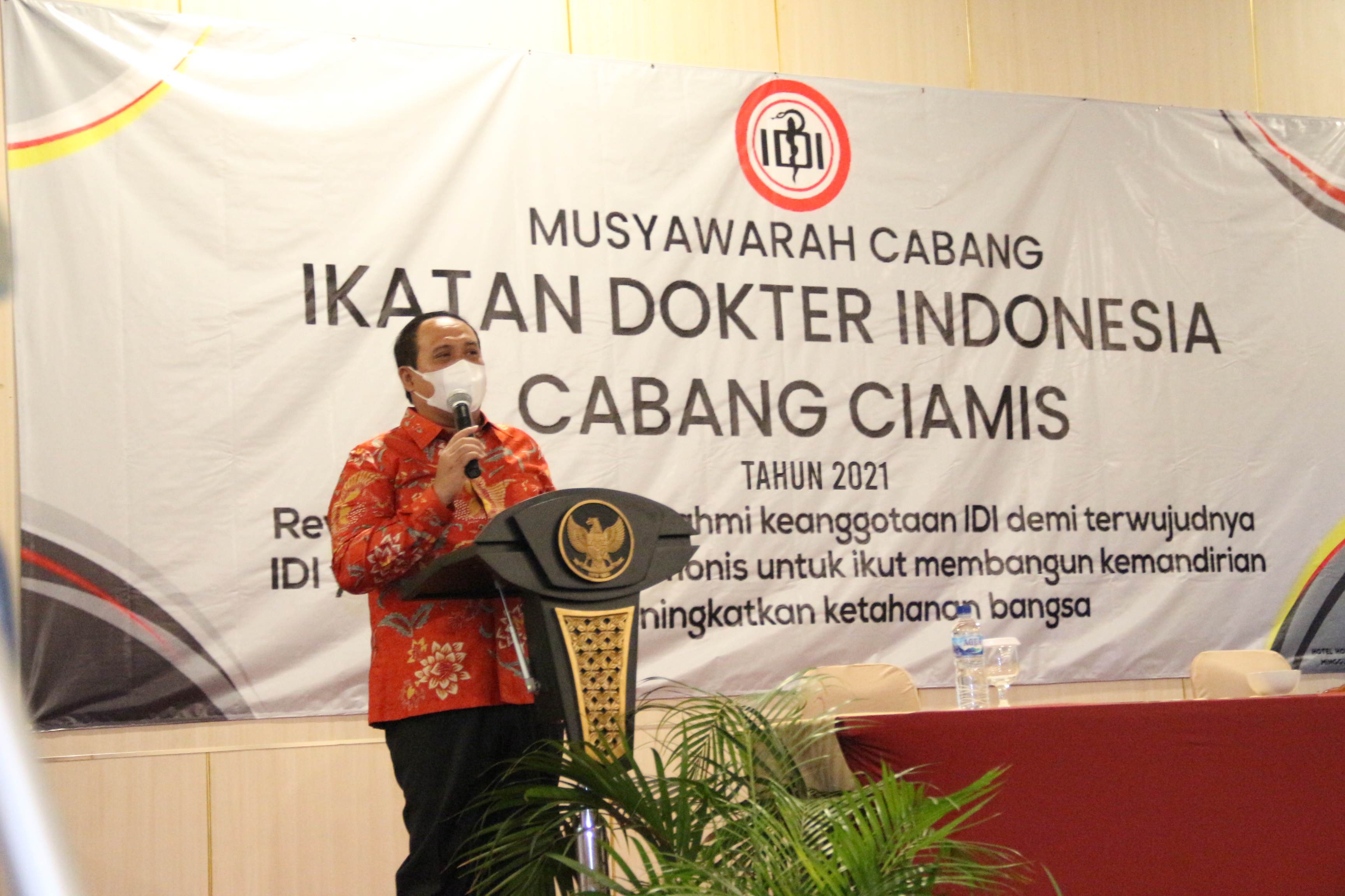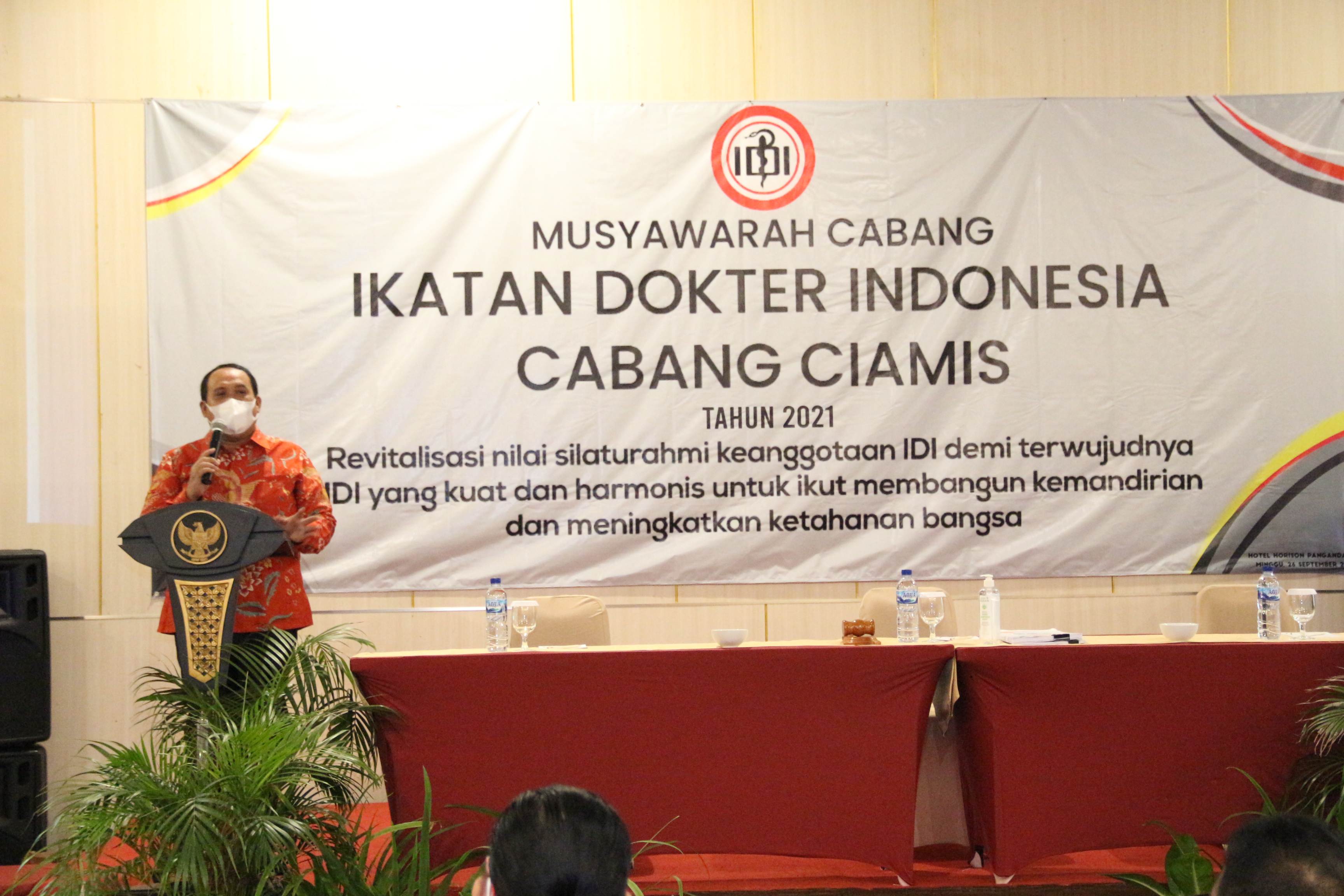 Bupati Pangandaran H. Jeje Wiradinata hadiri Acara Musyawarah Cabang (Muscab) Ikatan Dokter Indonesia (IDI) Cabang Ciamis Tahun 2021, dengan agenda pembentukan IDI Cabang Pangandaran, bertempat di Hotel Horison Palma Pangandaran. Minggu, 26 September 2021.