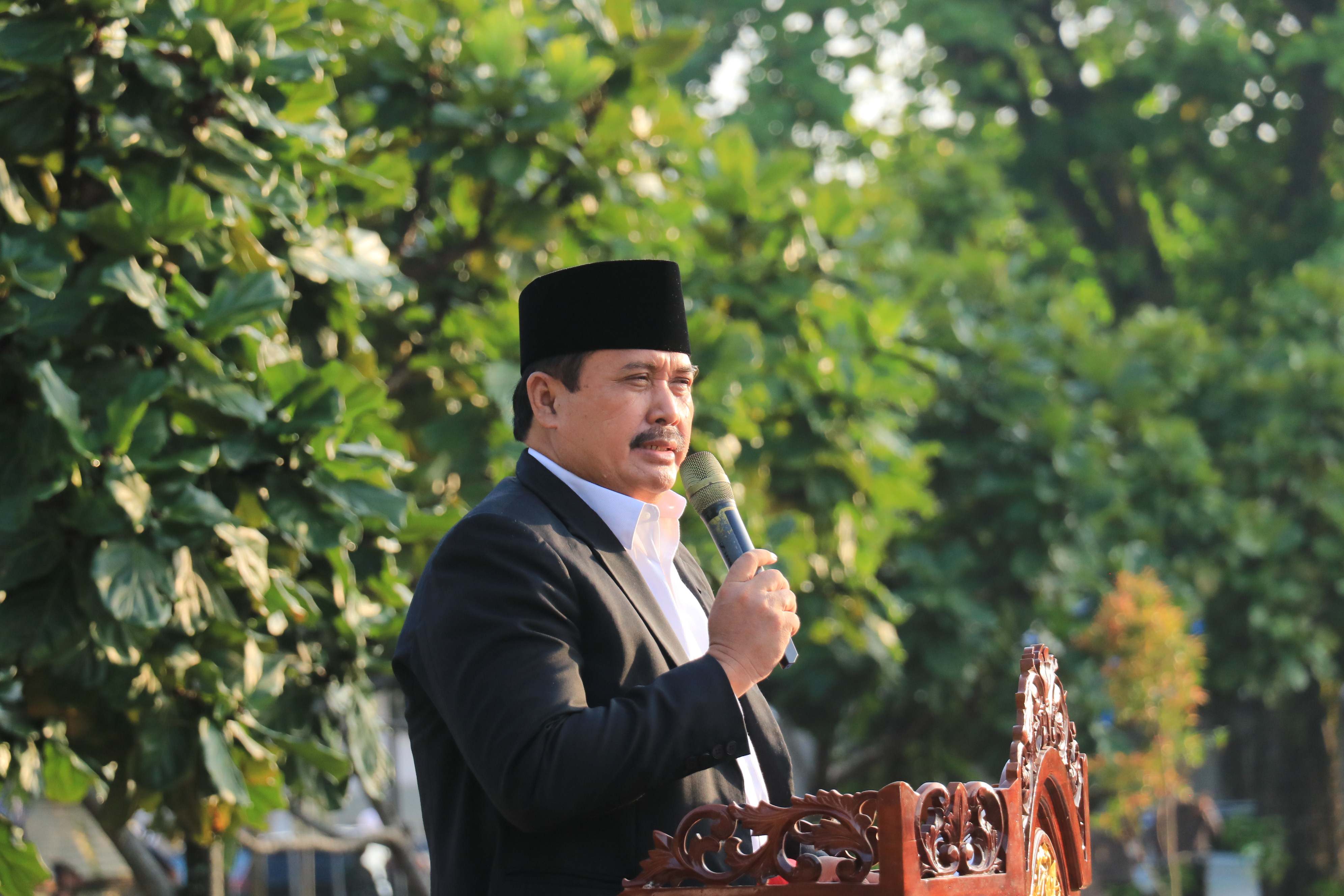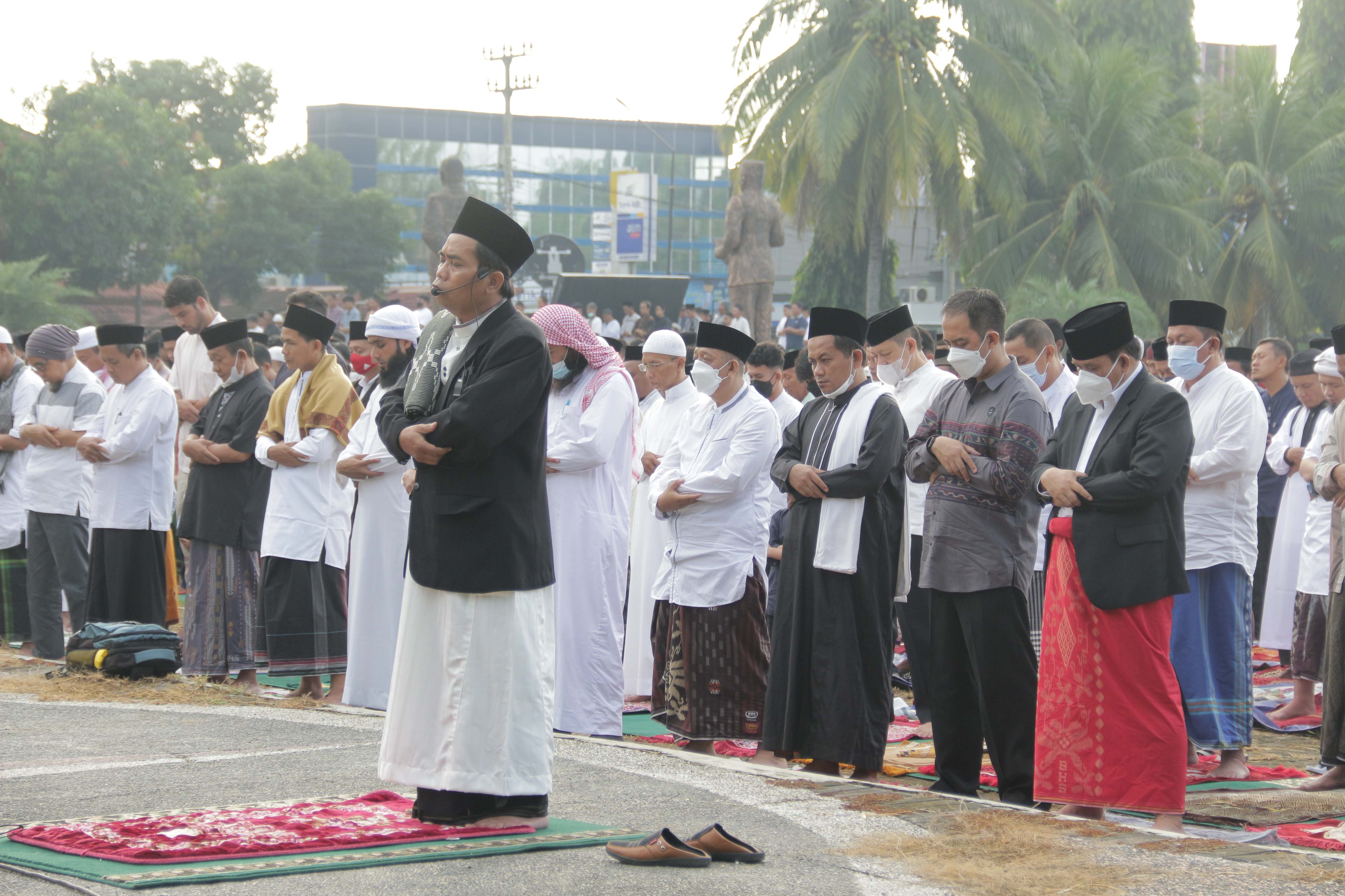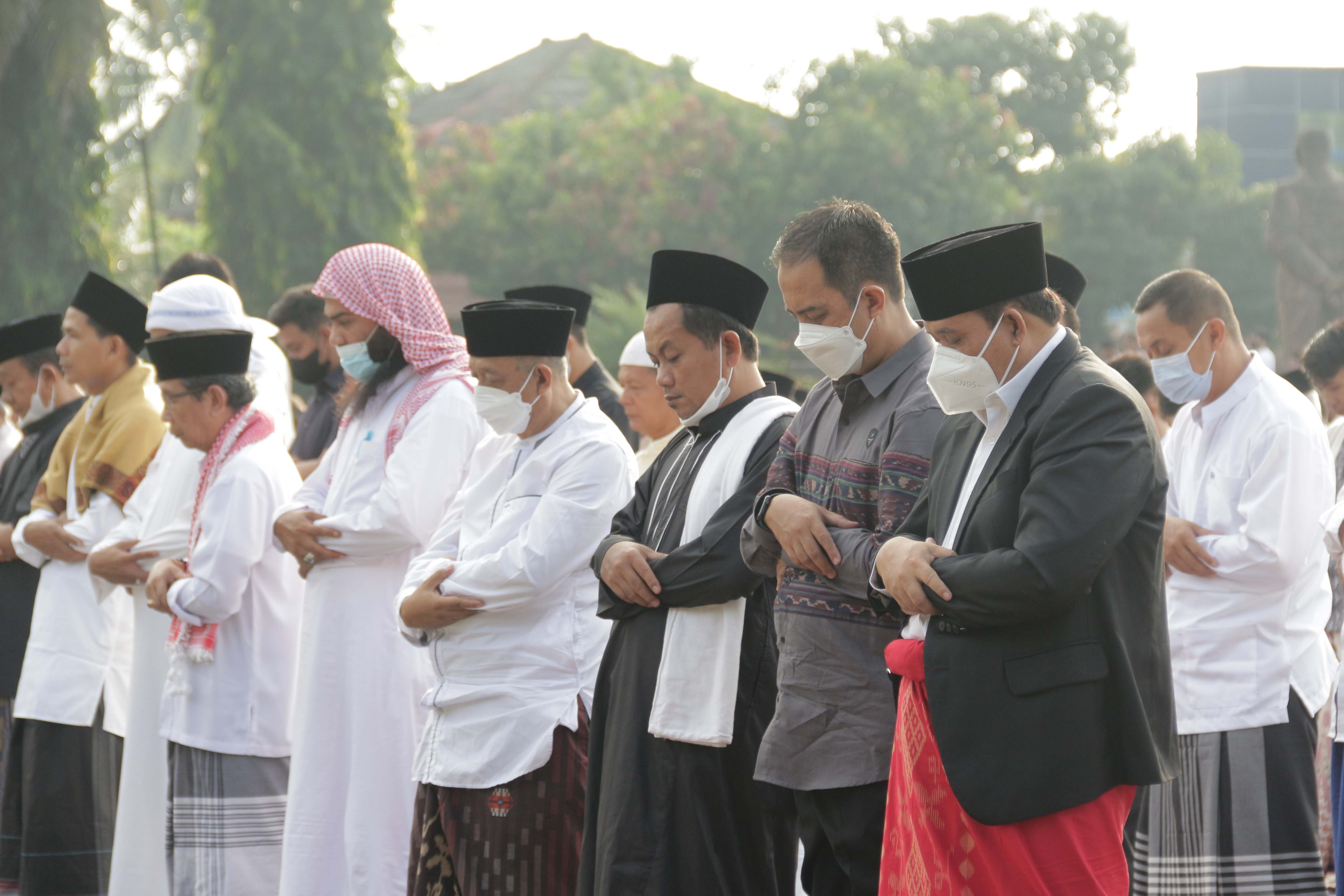 Bupati Pangandaran H. Jeje Wiradinata dan Wakil Bupati Pangandaran H. Ujang Endin Indrawan bersama Sekretaris Daerah Kabupaten Pangandaran Dr. Drs. H. Kusdiana, MM, melaksanakan Salat Idul Fitri 1443 H di Lapangan Merdeka Pangandaran, Senin (2/5/2022).