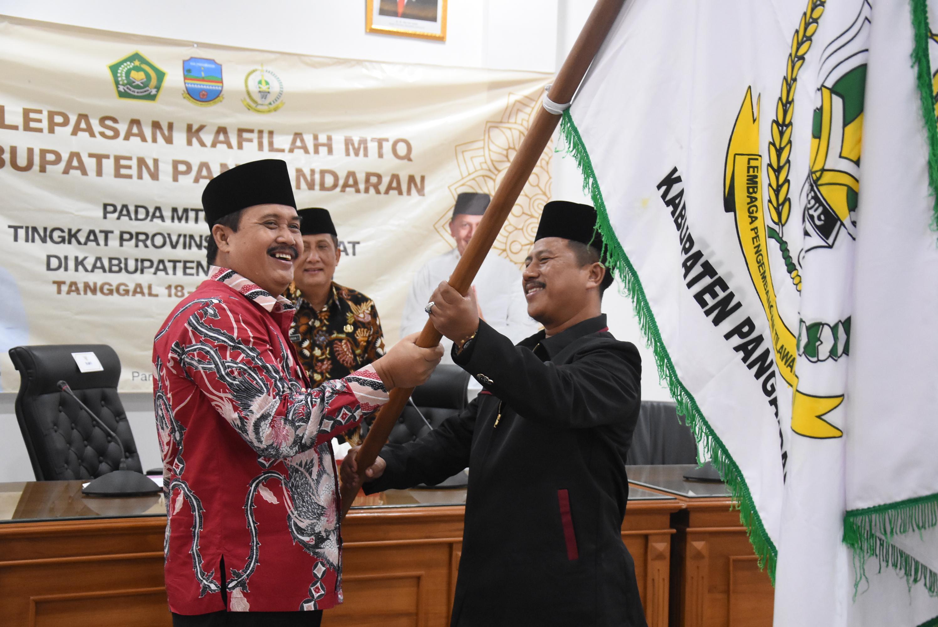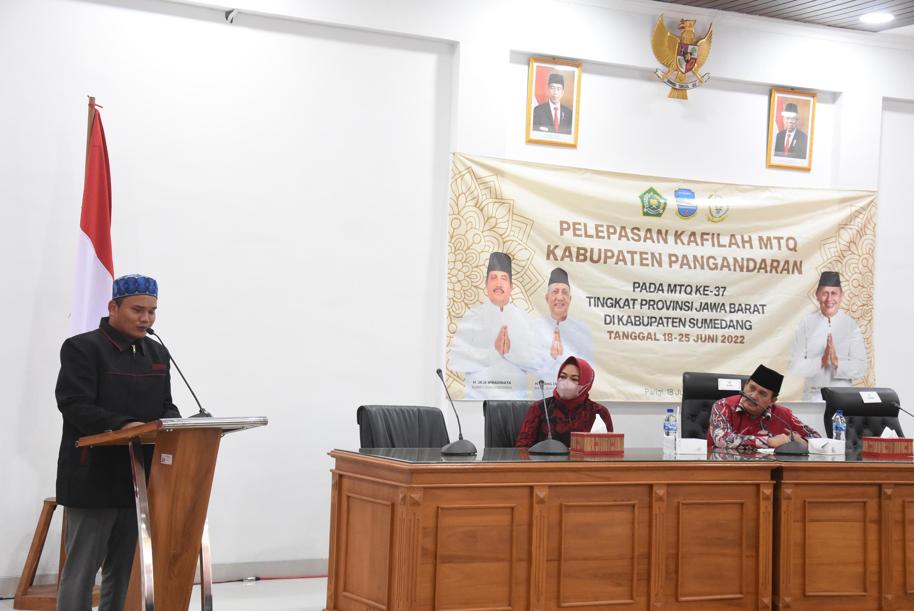 Bupati Pangandaran H. Jeje Wiradinata melepas Kafilah Kab. Pangandaran pada MTQ Ke-37 tingkat Provinsi Jawa Barat yang digelar pada 18-25 Juni 2022 di Kabupaten Sumedang, bertempat di Aula Setda Pangandaran. Sabtu, 18 Juni 2022.