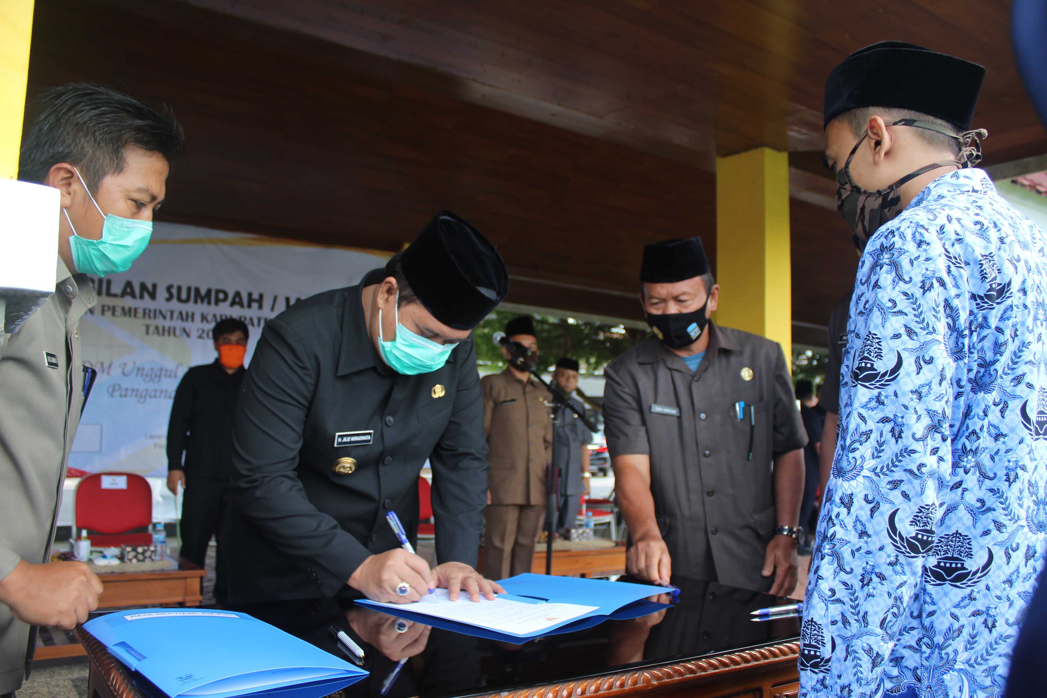 Bupati Pangandaran H. Jeje Wiradinata mengambil Sumpah / Janji PNS Lingkup Pemkab Pangandaran Tahun 2020, bertempat di Alun-alun Parigi. Rabu, 8 Juli 2020