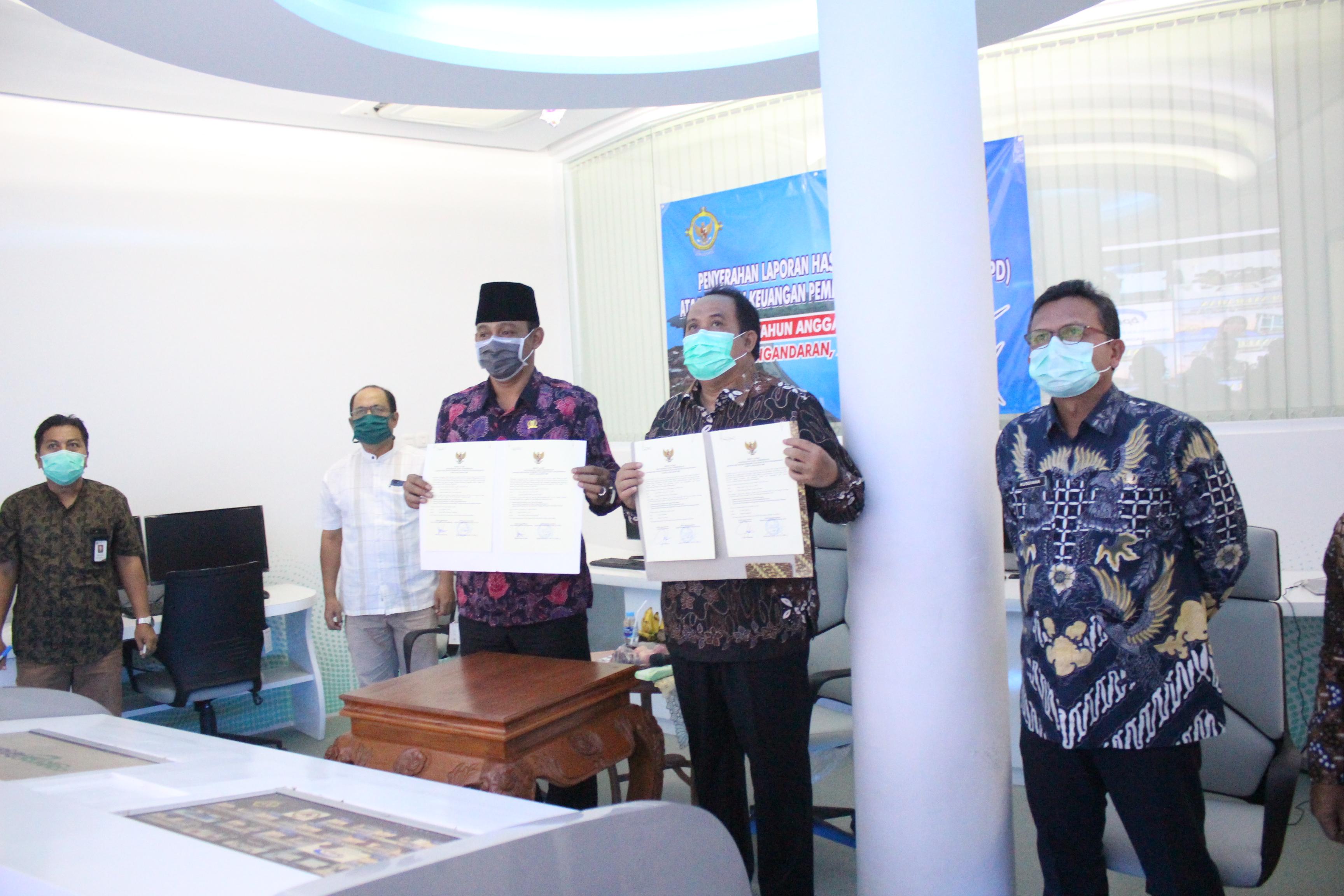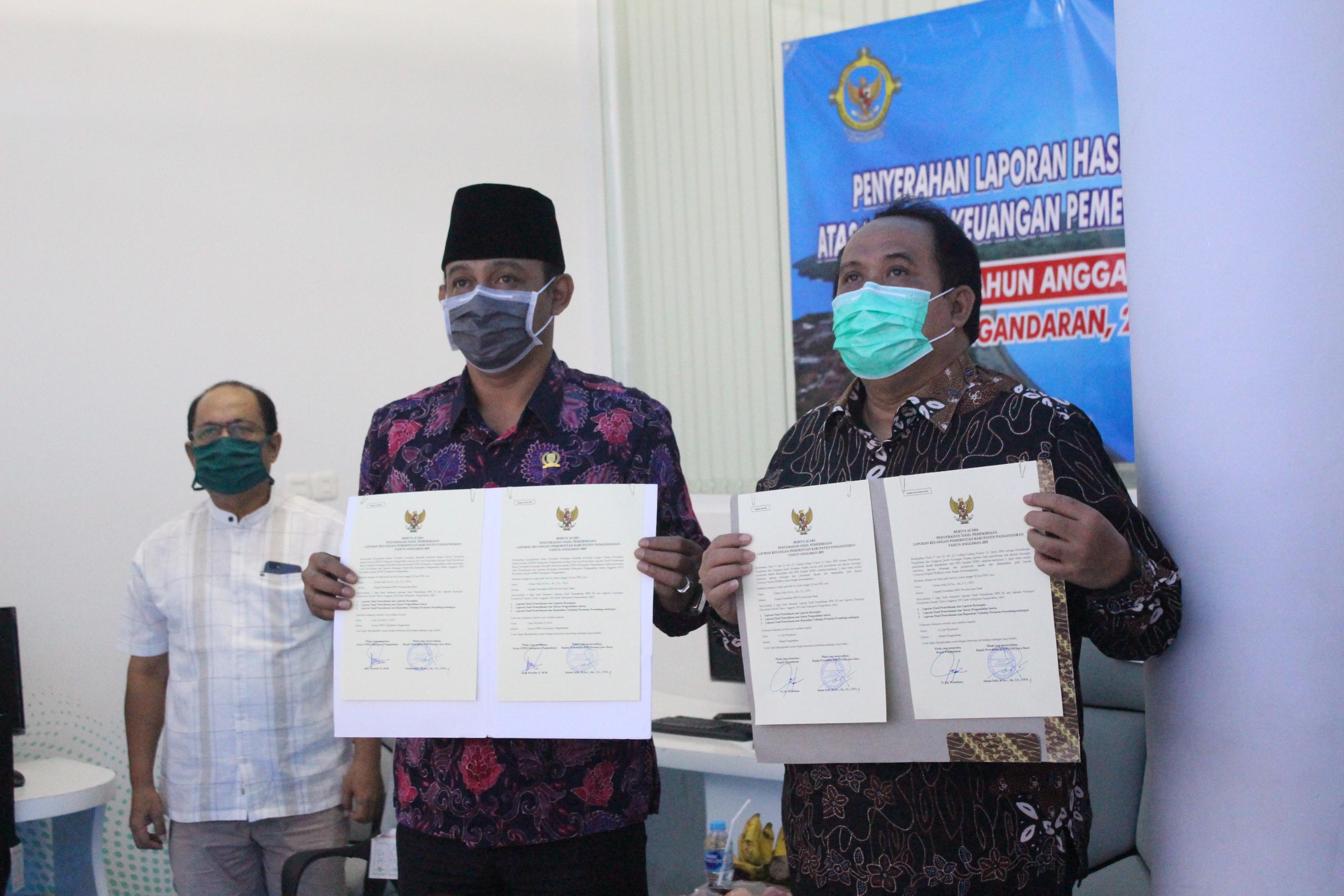 Bupati Pangandaran H. Jeje Wiradinata didampingi Sekda Kab. Pangandaran Drs. H. Kusdiana, M.M, mengikuti acara Penyerahan LHP LKPD Tahun 2019 secara virtual, bertempat di Command Center Pangandaran. Jum;at, 26 Juni 2020.