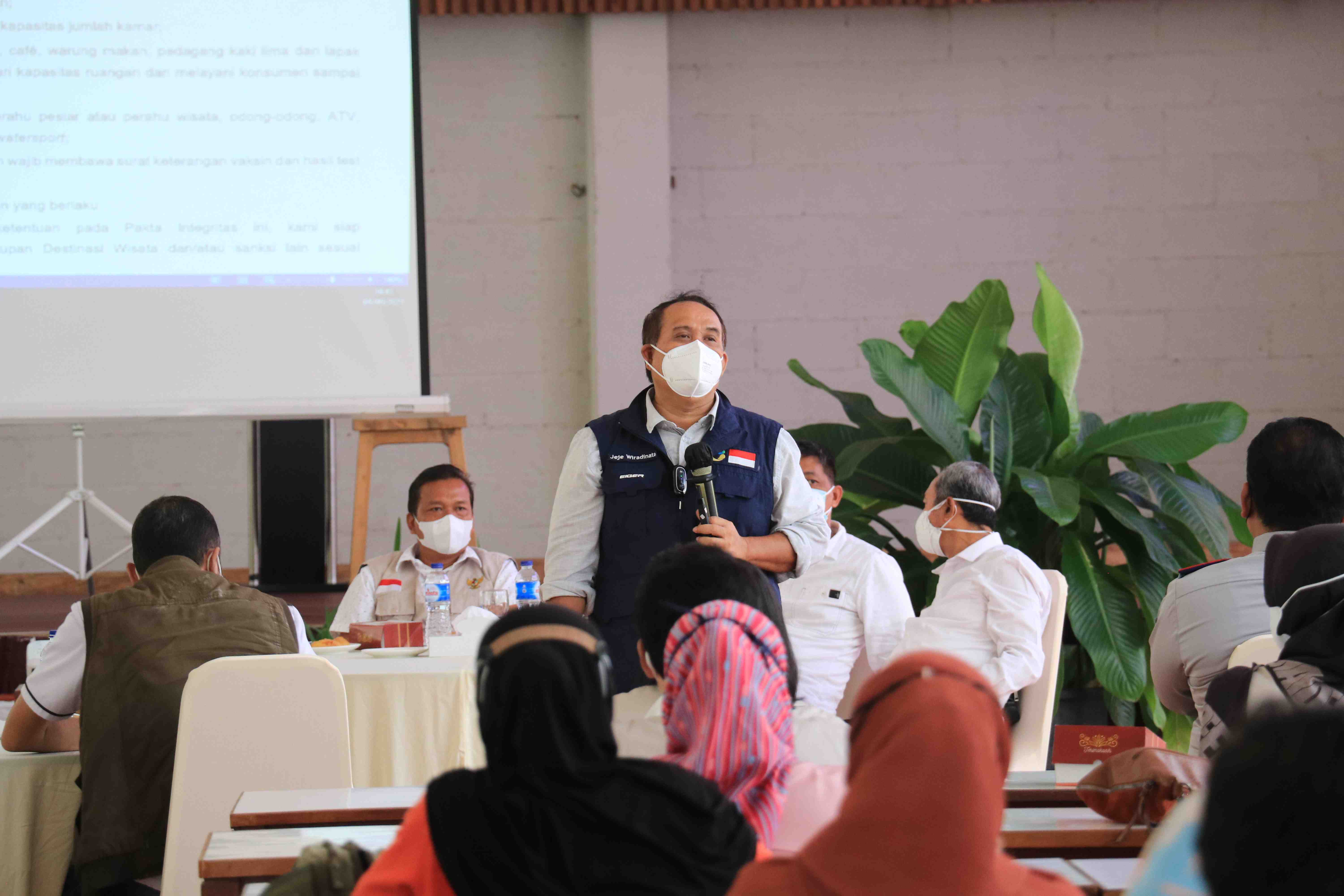 Bupati Pangandaran H. Jeje Wiradinata pimpin Rapat Tindaklanjut Instruksi Mendagri RI tentang PPKM Level 4,3,2 di Jawa dan Bali dengan para pelaku wisata Pangandaran dan Karapyak, bertempat di Hotel Pantai Indah Timur Pangandaran. Rabu, 1 September 2021.