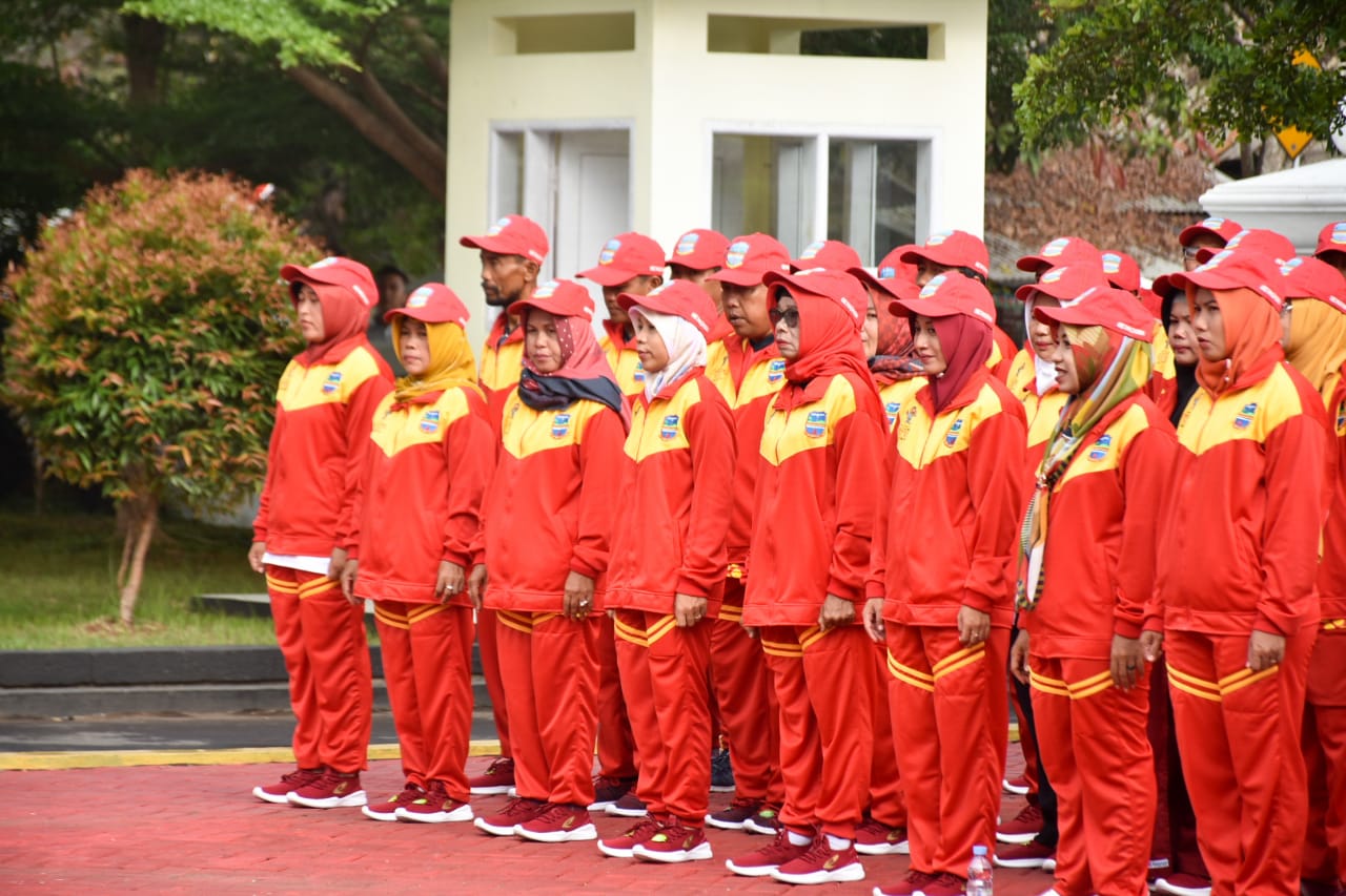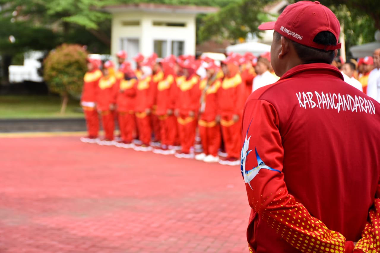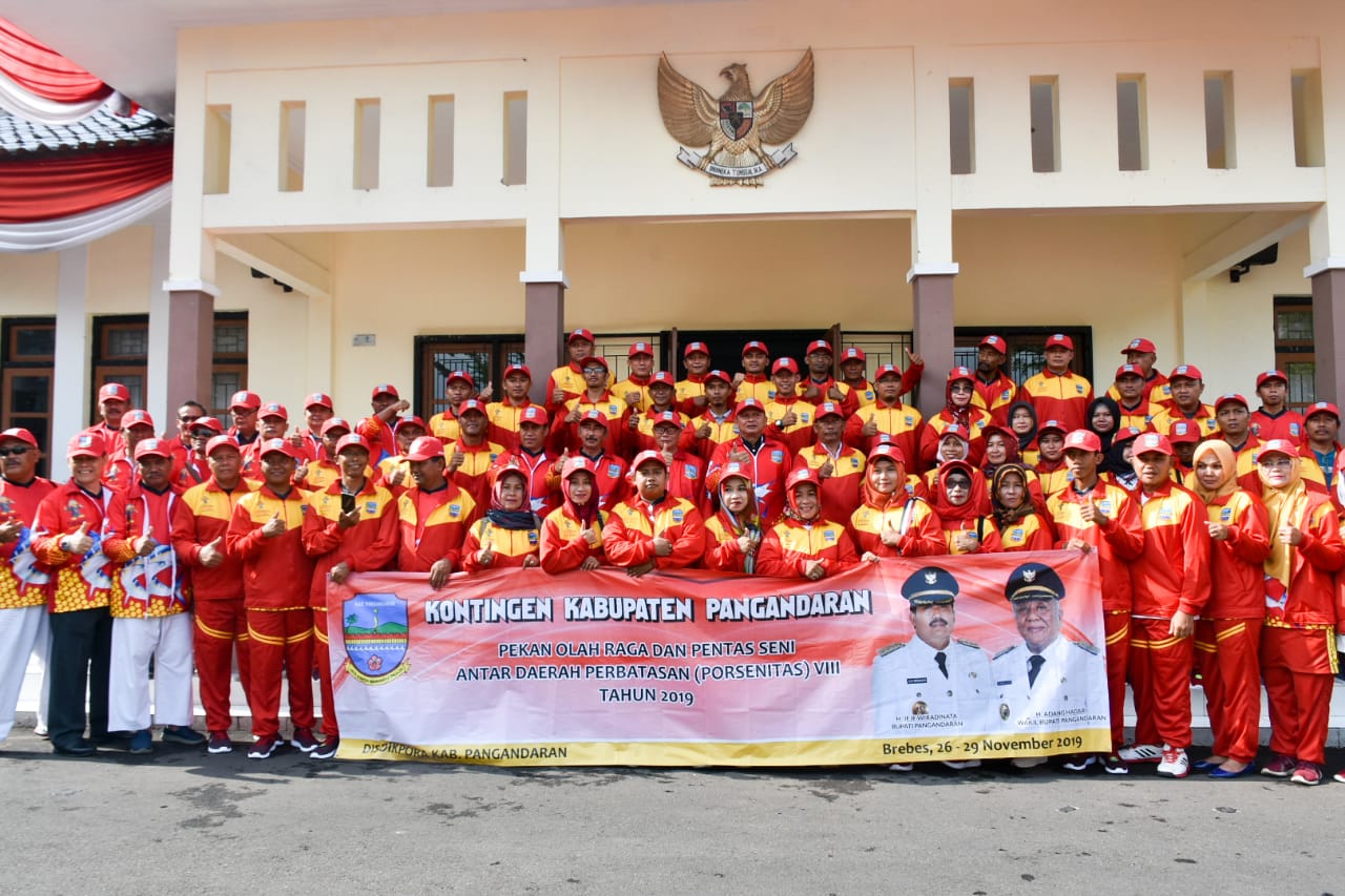 Sekretaris Daerah Kabupaten Pangandaran Drs. H. Kusdiana., MM melepas keberangkatan atlet Pekan Olahraga dan Seni Daerah Perbatasan (PORSENITAS) VIII Kabupaten Pangandraan yang akan berlaga di Kabupaten Brebes, Jawa Tengah, bertempat di Halaman Kantor Bupati Pangandaran, Senin, 25/11/2019.